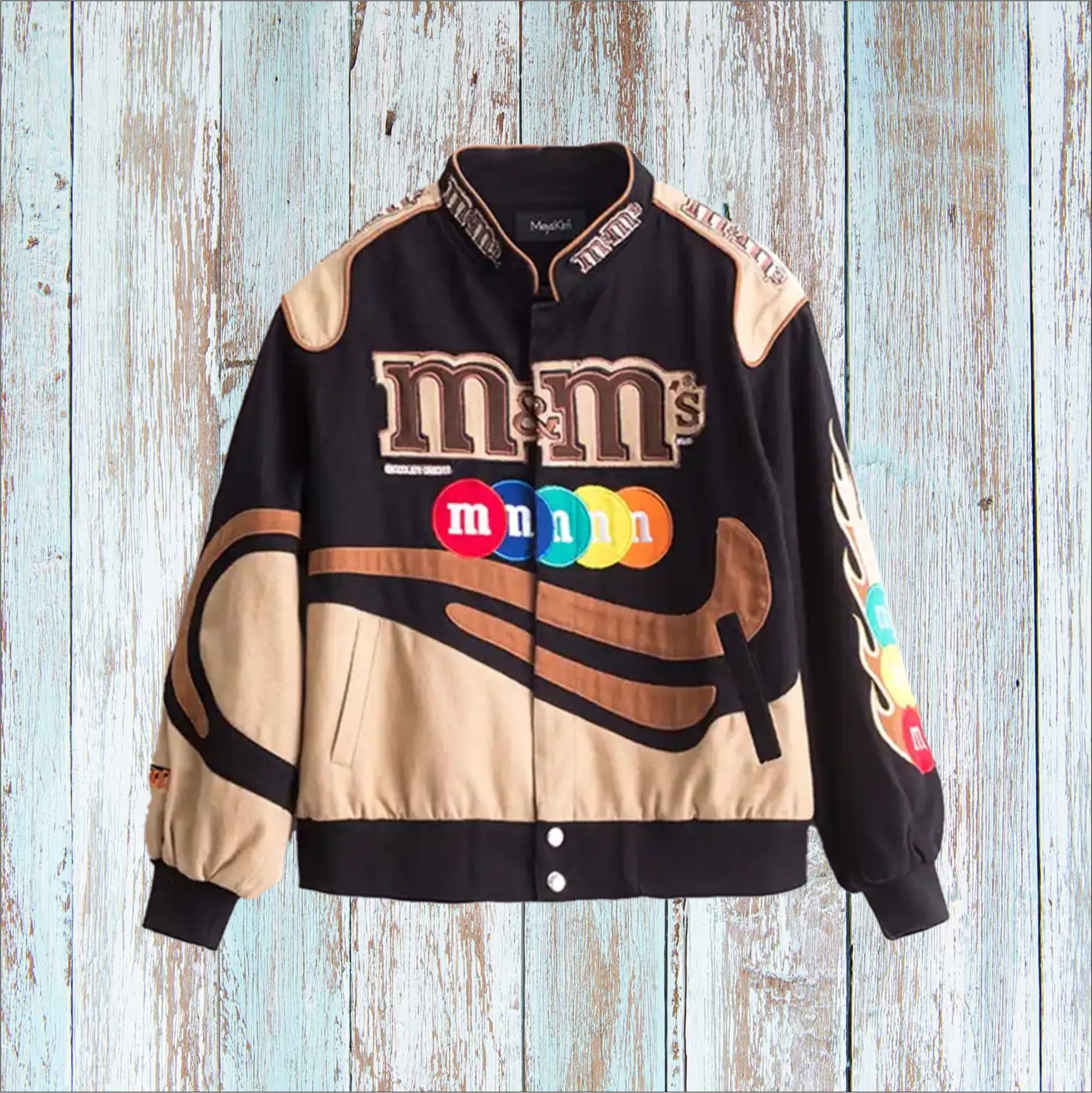 Secure the iconic racing jacket look with a sweet twist. The Vintage M&Ms Racing Jacket is built to last with super high quality details and embroidery. You're guaranteed to stand out in this vintage streetwear.